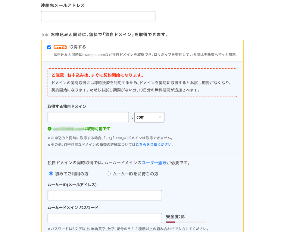 ロリポップのログイン用のパスワードを考えて入力します。 - 連絡先メールアドレス