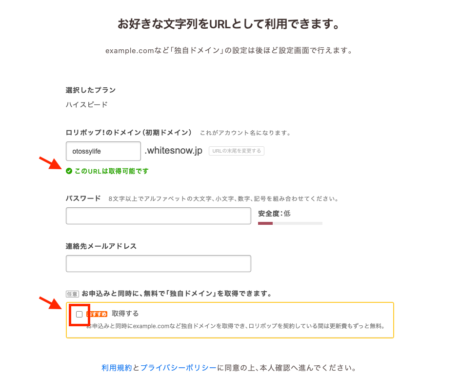 「お申込みと同時に、無料で「独自ドメイン」を取得できます。」にチェックを入れます。