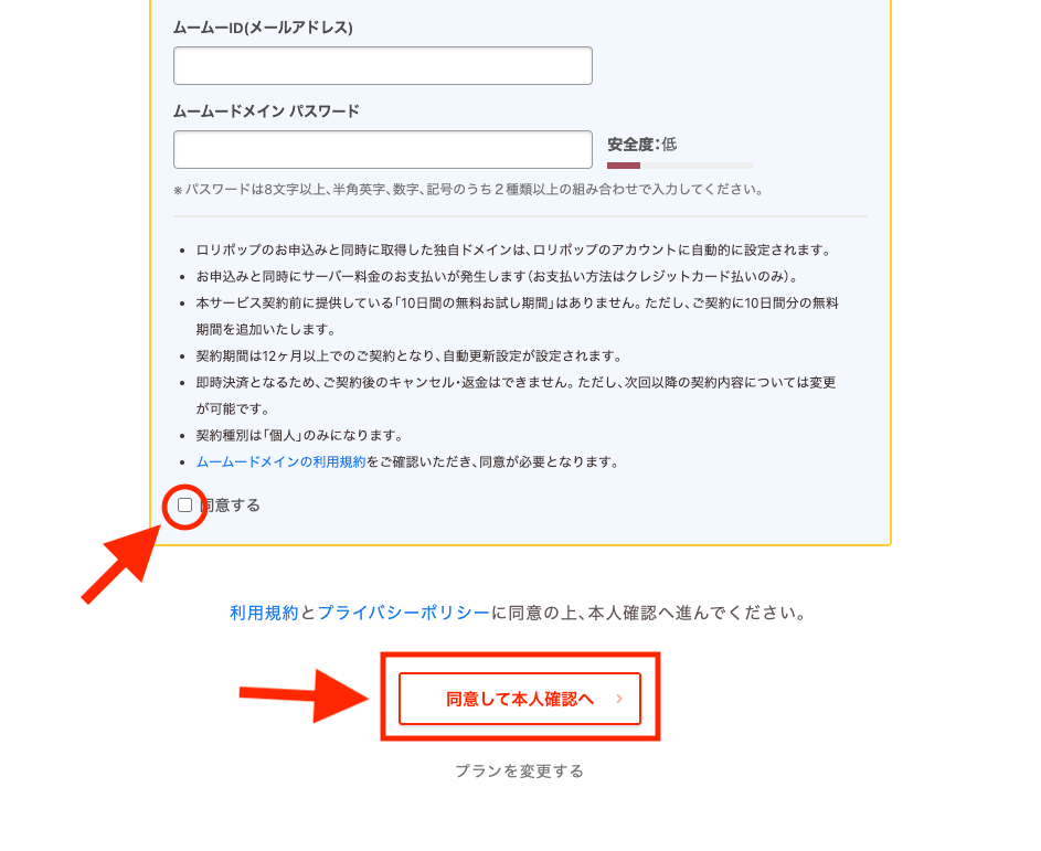 最後にしっかりと説明を読んだ後「同意する」にチェックを入れて、「同意して本人確認へ」ボタンをクリックします。