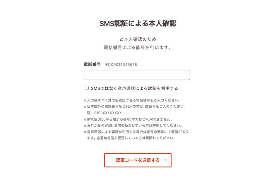 ※SMSが使えない場合は「音声通話による認証」にチェックを入れてください