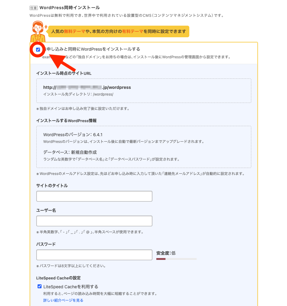 「お申し込みと同時にWordPressをインストールに」チェックを入れて、ブログの情報を入力します。