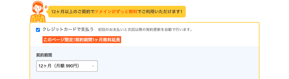 独自ドメインを無料にするには12ヶ月以上の契約が必要です。