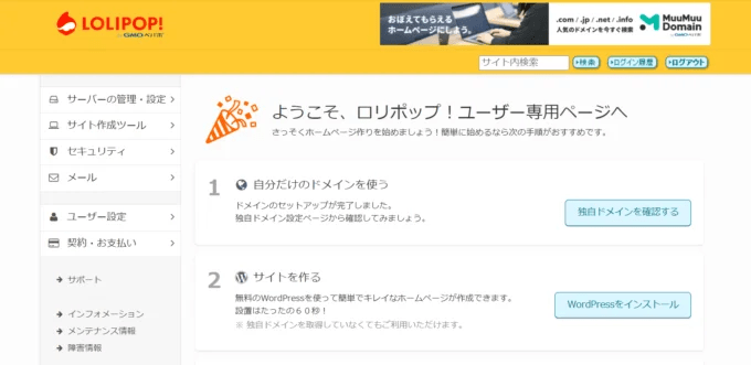 ロリポップではハイスピードプランを12ヶ月以上契約すると、独自ドメインが無料の特典がついてくるので、ここでその設定を行います。