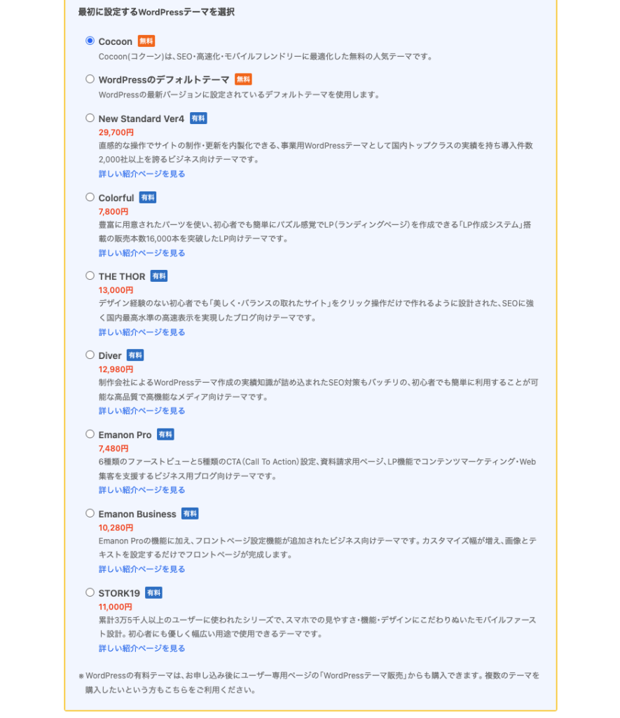 好みのテーマがないのであれば、とりあえず無料のテーマ「Cocoon」を選びましょう。