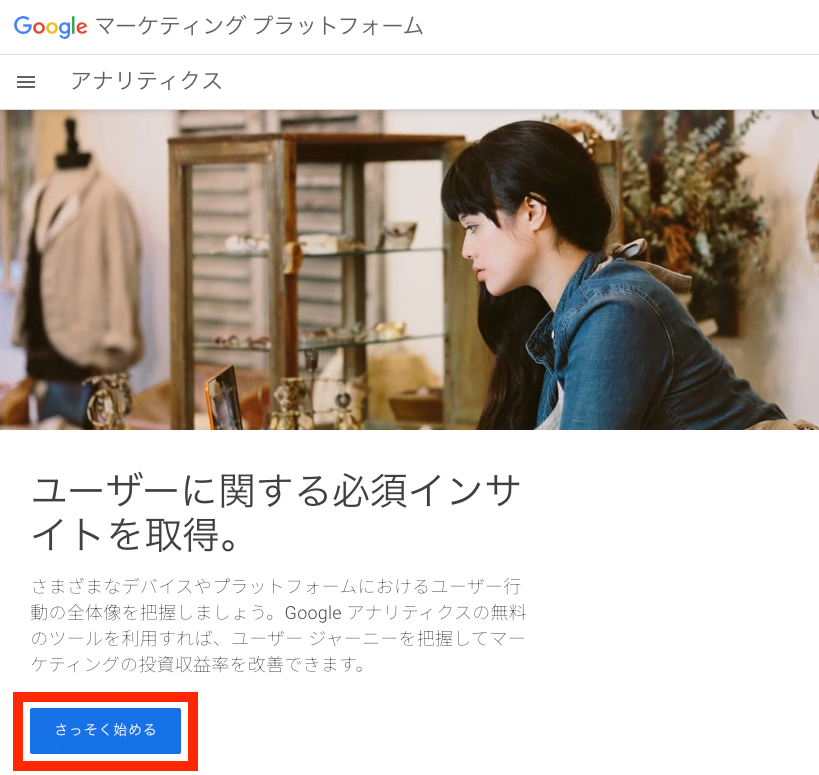 アナリティクスを使うGoogleのアカウントにログインしている状態で、Googleアナリティクスのページに移動し「さっそく始める」をクリックします