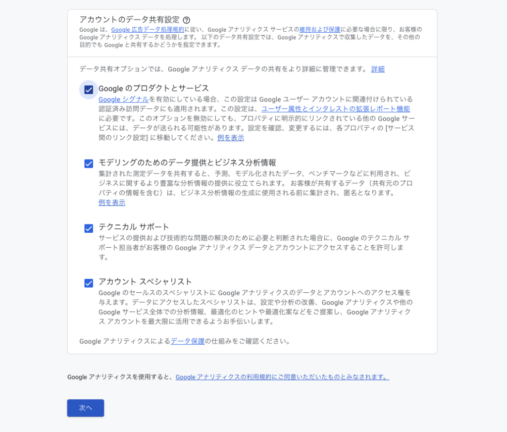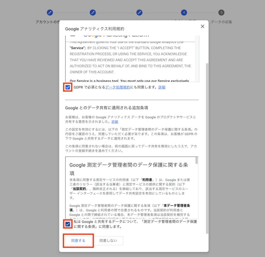 「Googleアナリティクス利用規約」と「Googleとのデータ共有に適用される追加条項」をしっかりと読んで、各同意項目にチェックを入れると「同意する」がクリックできるようになります。