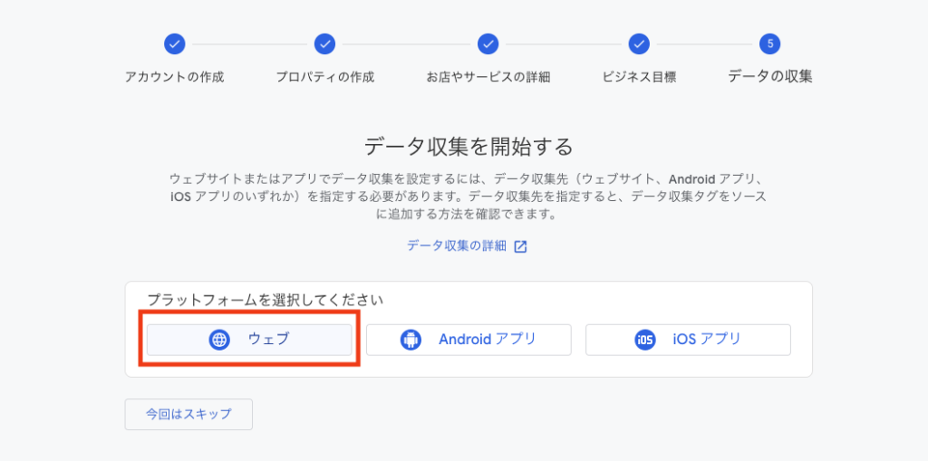 今回はWordPressを使ったWebサイト(=ブログ)を分析したいので「ウェブ」を選択します。
