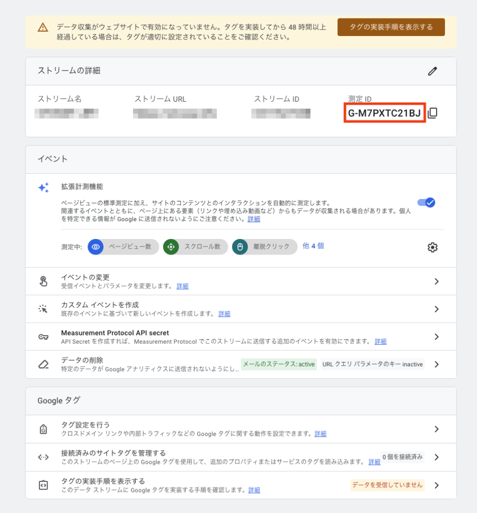 このページで表示されている測定ID(画面右上のG-から始まる文字)をコピーします。