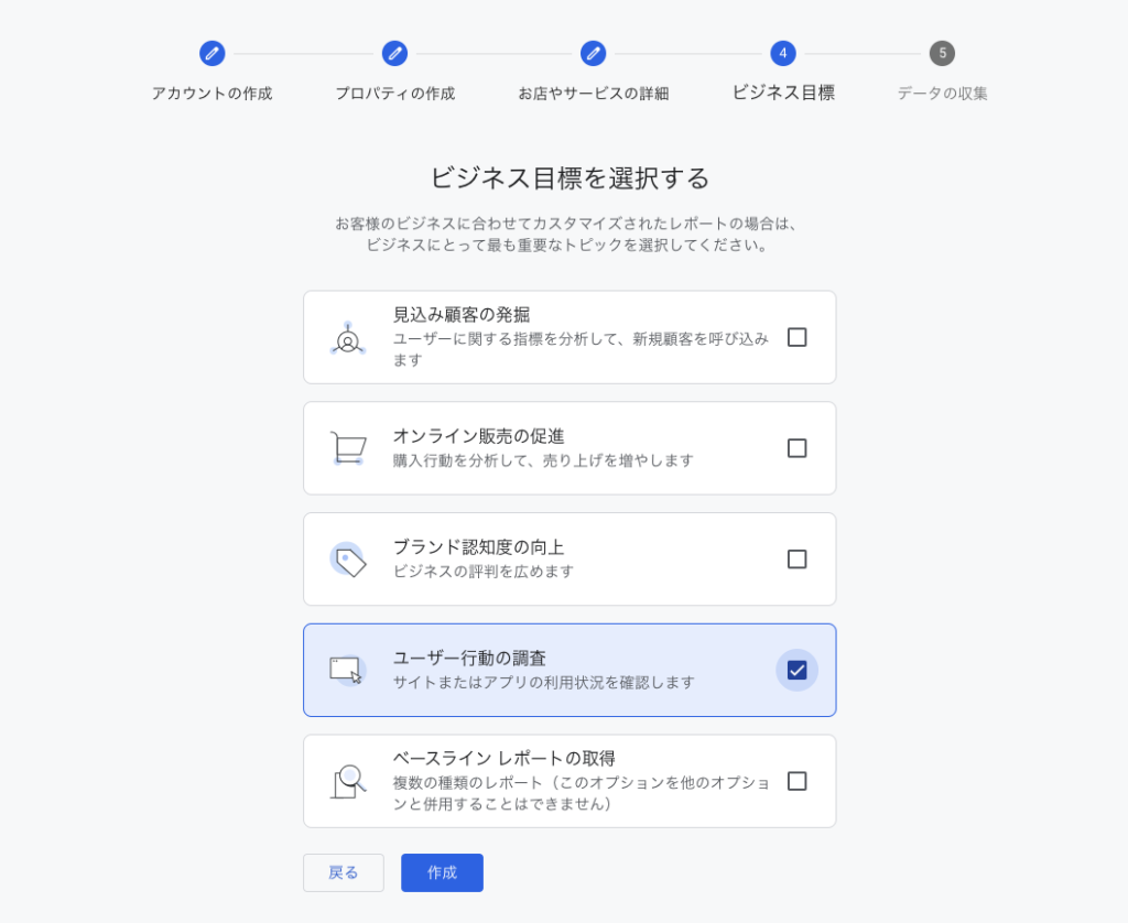 特になければ「ユーザ行動の調査」を選択すればOKです。