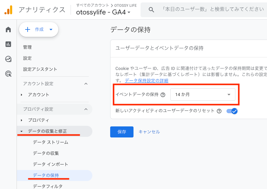 管理ページの「データの収集と修正」→「データの保持」をクリックし「イベントデータの保持」の14ヶ月を選択します。
