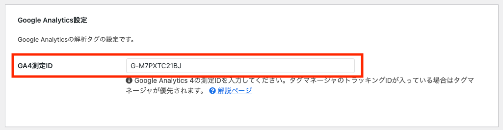 「アクセス解析・認証」ページの真ん中くらいに「Google Analytics設定」という欄があるので、その中の「GA4測定ID」に先程コピーしたIDを入力(ペースト)します。
