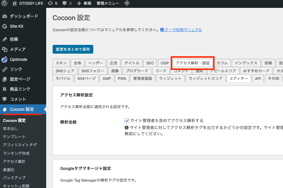 コピーしたらWordPressの管理画面に移動し、「Cocoon設定」の「アクセス解析・認証」を選択します。