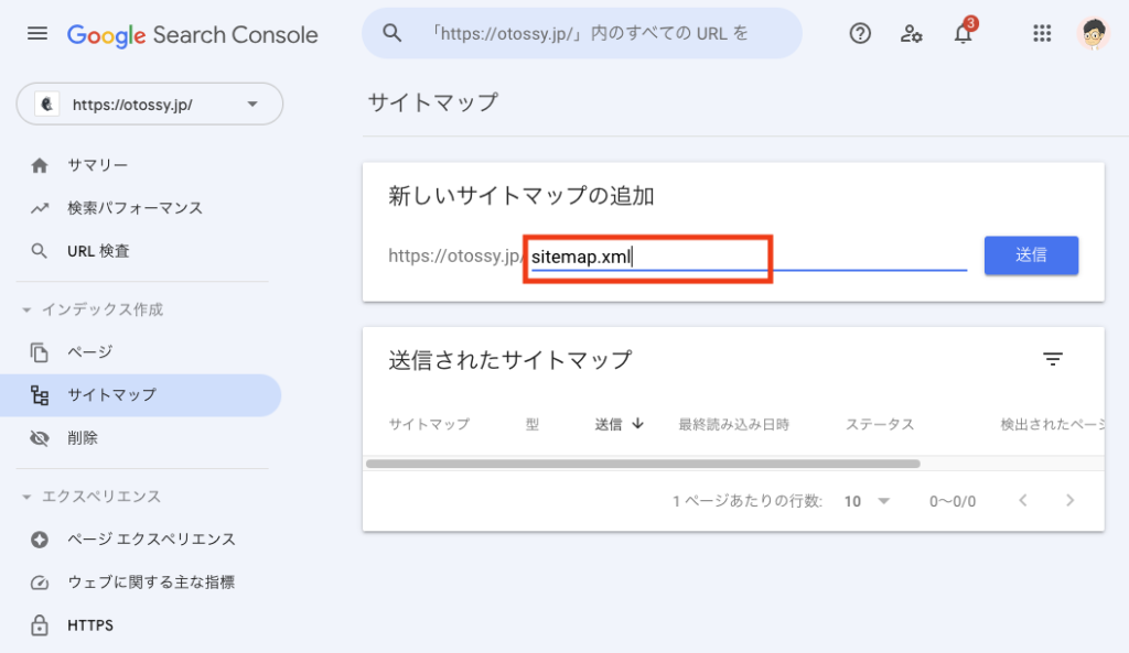 2.「新しいサイトマップの追加」に sitemap.xml を入力し「送信」をクリックします。
