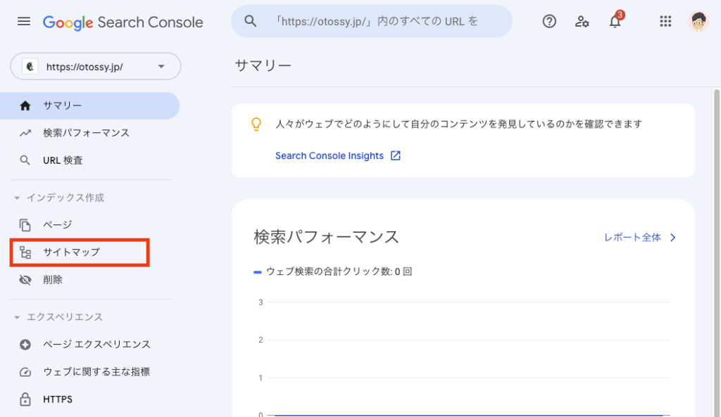1. Googleサーチコンソールにアクセスし、左のメニュー欄から「サイトマップ」をクリックします。